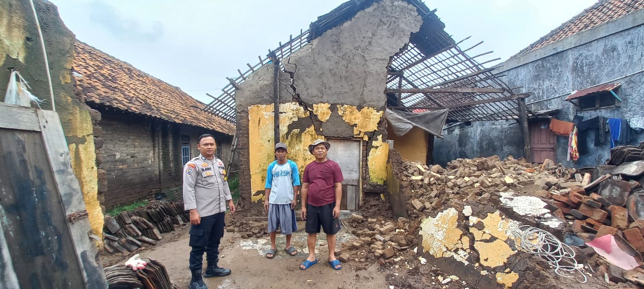 Cilegon - Bhabinkamtibmas Kelurahan Tegal Ratu, Brigadir Dede Abu, langsung melakukan pengecekan ke lokasi kejadian rumah rubuh di Lingkungan Kubang Saron RT 004 RW 002 Kelurahan Tegal Ratu Kecamatan Ciwandan Kota Cilegon.