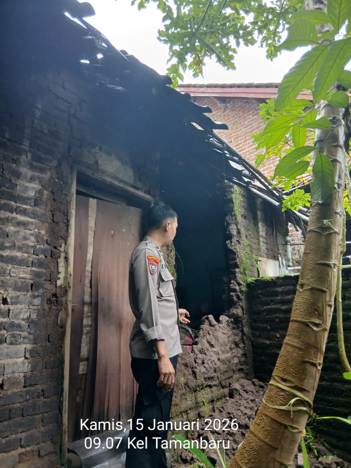 Cilegon - Bhabinkamtibmas Kelurahan Tamanbaru AIPDA Edianto, mengunjungi Ibu Marni yang rumahnya roboh bagian dapur akibat hujan angin di Lingkungan Sondol Rt. 03/02 Kelurahan Tamanbaru Kecamatan Citangkil, Kamis (15/01/2026).