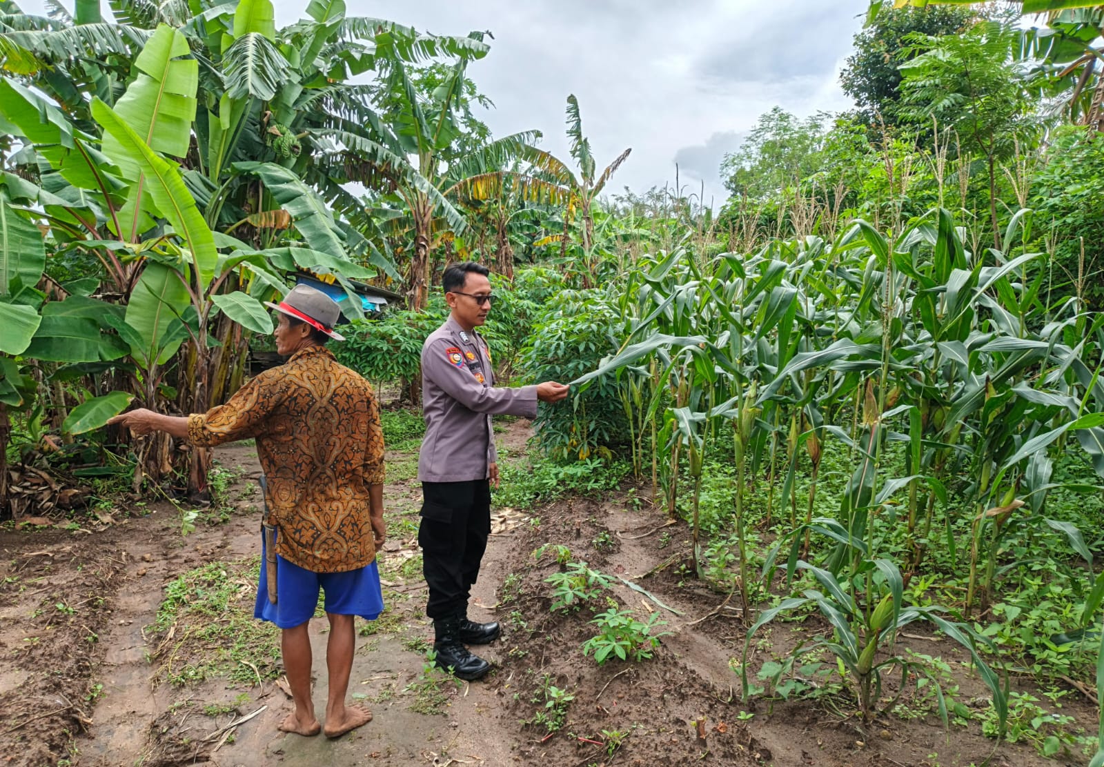 Dalam kegiatan monitoring ini, Bhabinkamtibmas meninjau langsung kondisi lahan jagung.