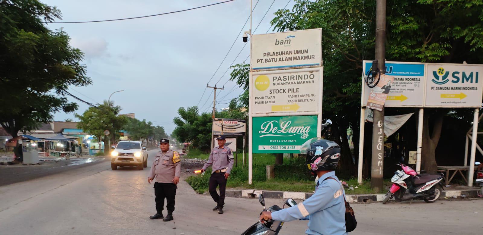 Ipda Gana Kanit Samapta dan Bripka Ghery Bhabinkamtibmas Laksanakan Gatur Lalin Pagi hari Di Simpang Jalan Raya Wadas Bojonegara