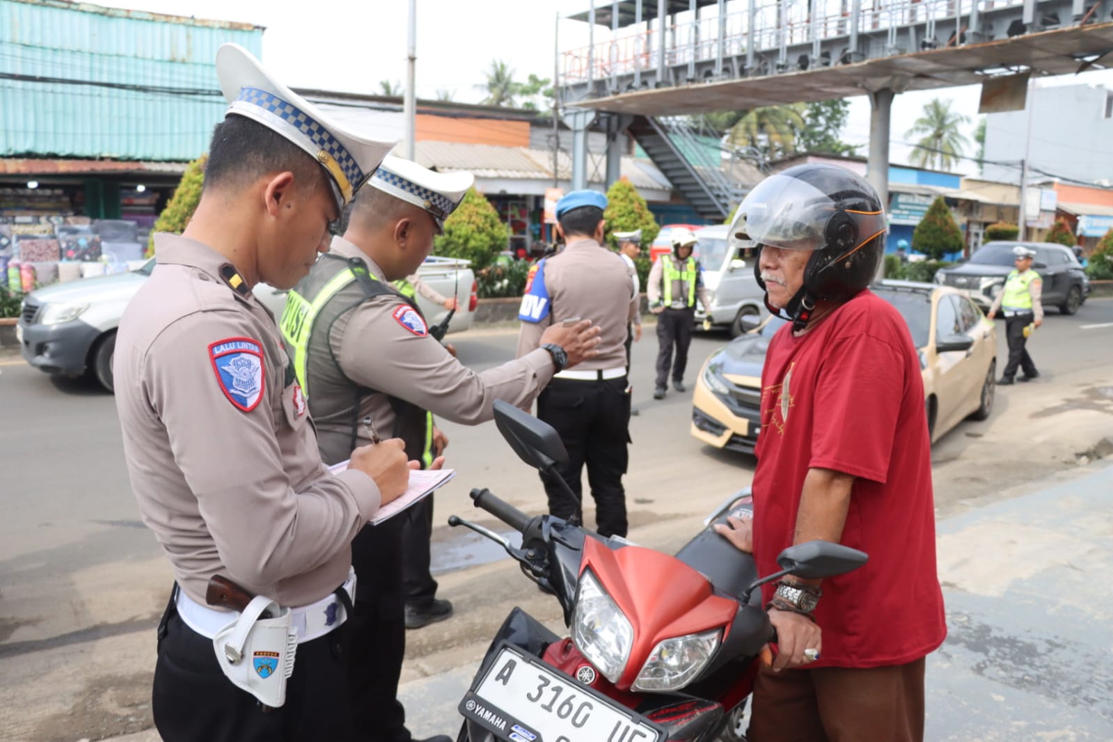 Petugas Sat Lantas Polres Cilegon memberikan edukasi langsung kepada masyarakat terkait pentingnya mematuhi peraturan lalu lintas, menggunakan helm SNI, melengkapi surat-surat kendaraan, serta mengutamakan keselamatan dalam berkendara.