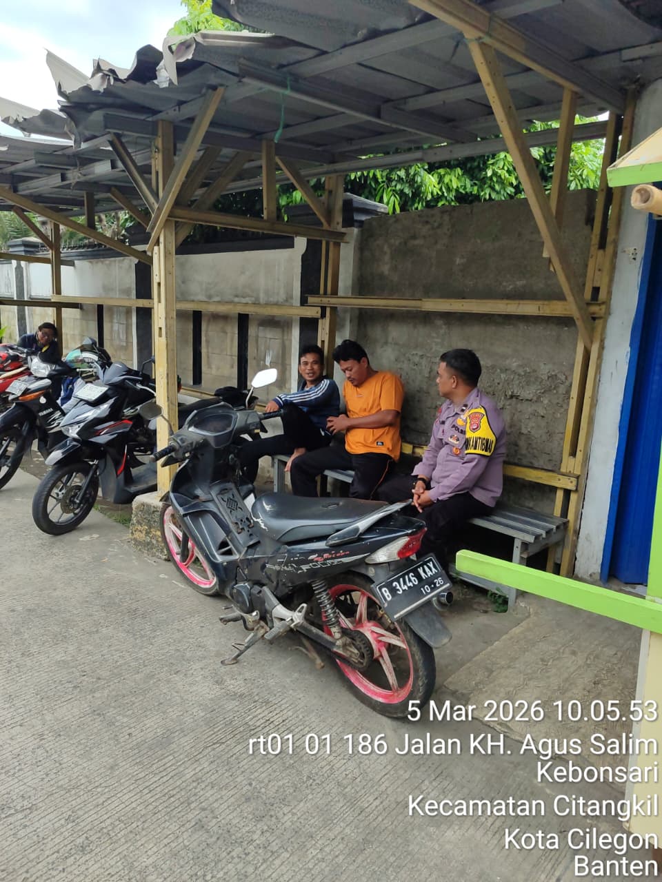 Cilegon - Guna mencegah gangguan kamtibmas, Personil Polsek Ciwandan Polres Cilegon Polda Banten melaksanakan giat Patroli dialogis dipangkalan Ojek (Opang) Pertigaan Simpang Warnasari Kelurahan Kebonsari kecamatan Citangkil, Kamis (05/03/2026).