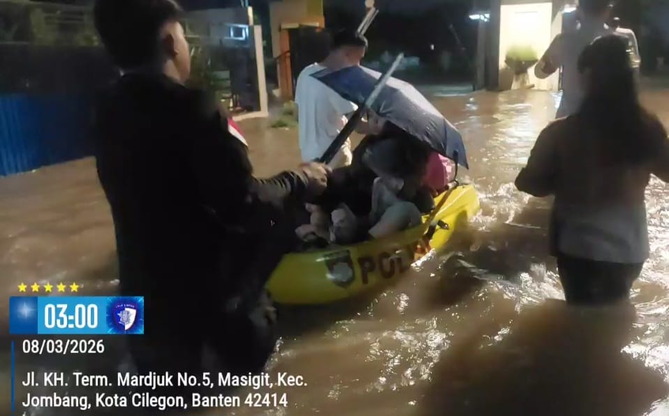 Polres Cilegon evakuasi warga yang terdampak genangan di Perumahan Metro Cilegon. . Minggu, 8/03/2026
