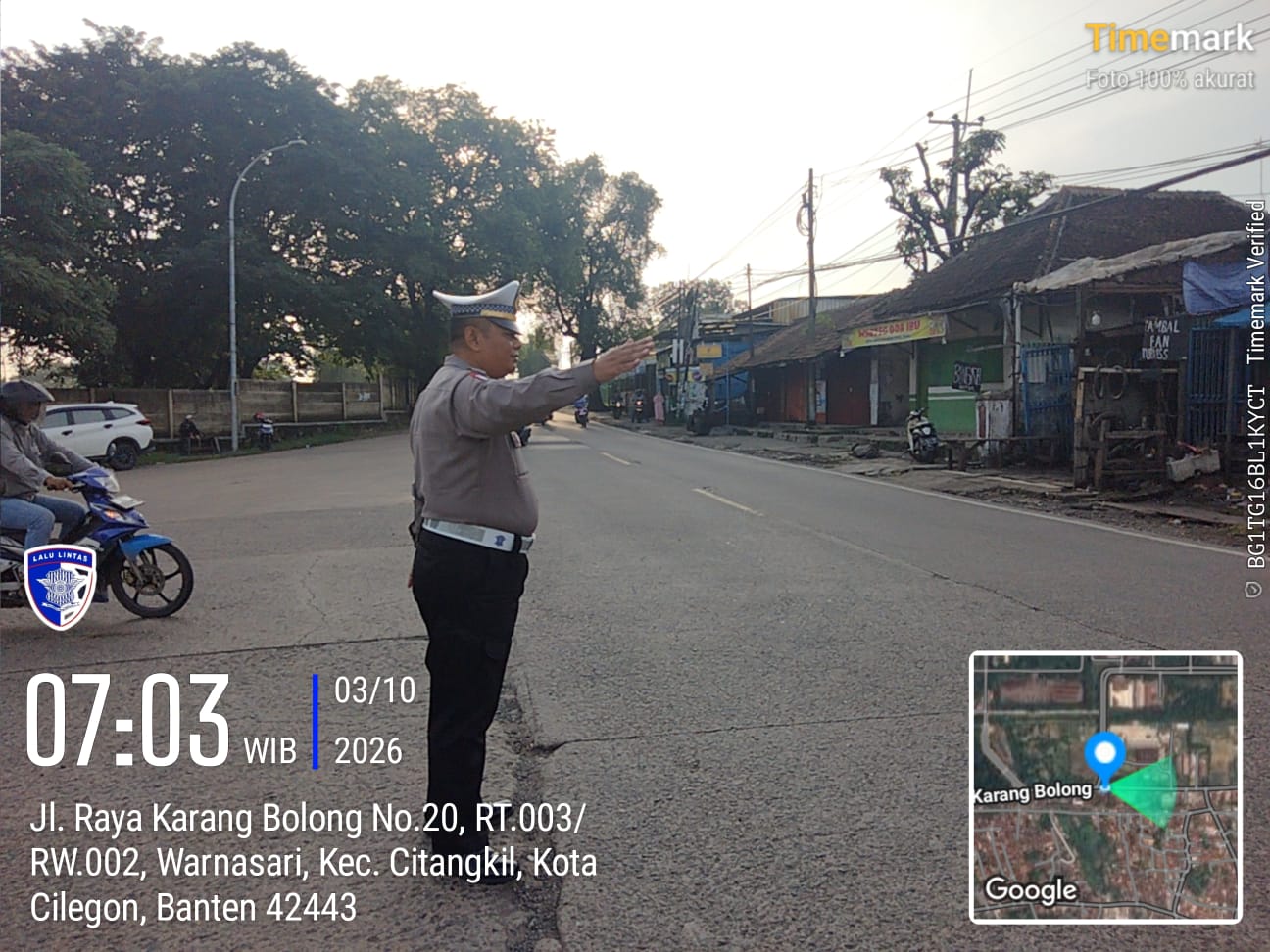 Cilegon - Guna Kelancaran Lalu-lintas Personil Unit Lantas Polsek Ciwandan Polres Cilegon Polda Banten melaksanakan pengaturan lalu-lintas di Simpang Beringin Ciwandan Pertigaan Kawasan Industri KSP/ KIEC I kelurahan Warnasari Kecamatan Citangkil Kota Cilegon, Senin (09/03/2026).