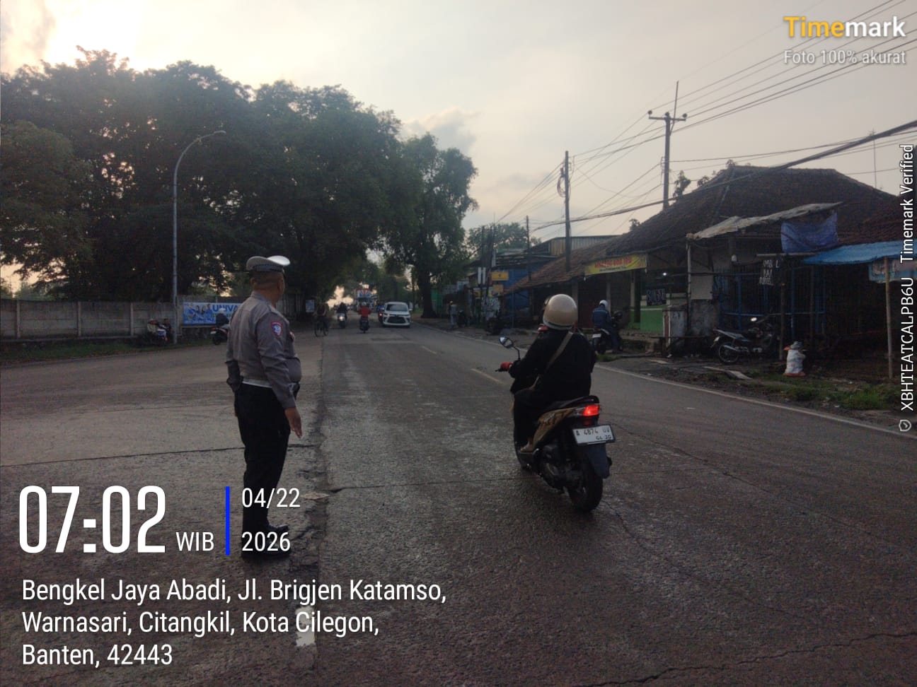 Cilegon - Pelayanan Prima Kepolisian Kepada Warga Masyarakat dan Guna menciptakan situasi lalu lintas yang aman, tertib dan lancar, Personel Unit Lantas Polsek Ciwandan Polres Cilegon Polda Banten secara rutin melaksanakan pengaturan lalu lintas, Rabu (22/04/2026).